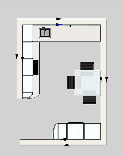 Я думаю, что такой вариант расстановки мебели самый оптимальный :) В темном углу лучше встроить холодильник, духовку и шкафы. Обеденный стол (1400х900) ближе к окну. Ширина проходов получается в приделах нормы :)
