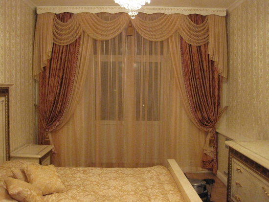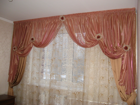 Эти модельки шьются, если нужно, могу проконсультировать как кроить, а можно сделать вариант как предлагает Татьяна. Твои шторы плотные попесить на последнюю направляющую к окну (пусть они будут как фон или темные шторы), затем повесить тюль с рисунком интересным (можно бежевый или золотистый фон основы и яркие ромашки, маки или мелкие цветочки), а на штангу повесить несколько полотен однотонной тюли 3-4 ( цвет лучше чтобы совпадал с цветом цветочков) и задрапировать как на нижнем фото, это не сложно, тоже могу рассказать как.