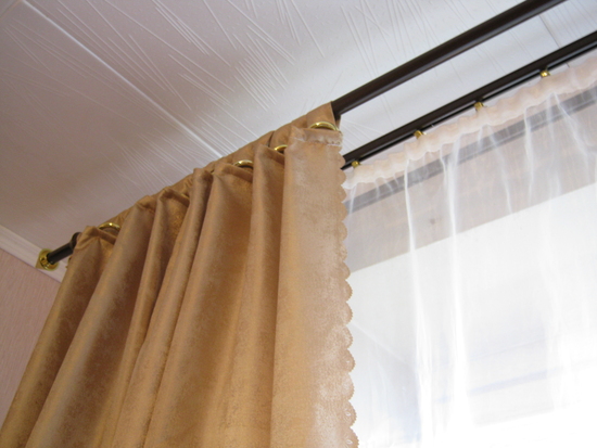 Декор окон. Текстиль. Жалюзи.Девочки, подкинте идеи, у меня карниз техрядный, первый ряд в виде трубы, на концах наконечники. Я на эту трубу сшила шторы с петлями, но уже надоели и белая тюль на втором ряду. Вот хотелось бы что нибудь новенького сшить, шторы мы закрываем. А цвет карниза коричневуй, шторы золотые однотонные, но не сильно плотные, а комнота нежно розовая. Подскажите, а то прям как то грустно на все это смотреть.