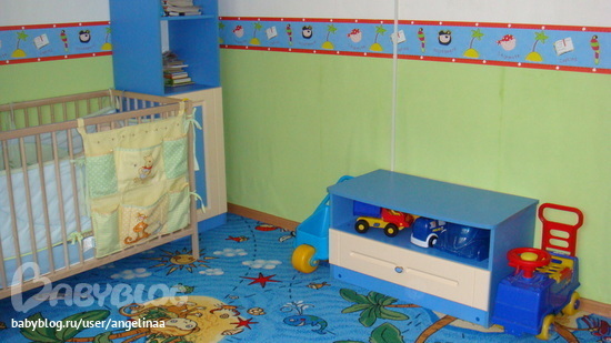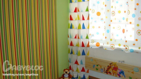 Началось все еще летом (в июле), сразу после нашего отпуска.....Я, будучи уже пузатой на 20 неделе, сама обдирала обои, штукатурила и шпаклевала стены. Не скажу, что получилось мастерски, но опыт у меня теперь есть)))) Потом я купила обои. Основой послужили стеклотканевые обои, которые я потом покрасила. Их я выбрала не случайно, а потому, что они имеют свойство не пропускать грибок. А с нашими сырыми стенами это большой ПЛЮС!!! Одну стену я решила выделить яркими обоями, обозначив ими игровую зону. Сказать по правде, первое, что я купила был имеено рулон этих обоев, потому что мне безумно понравилась расцветка и очень демократичная цена - 60р.