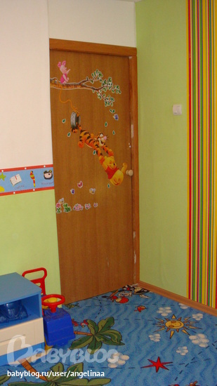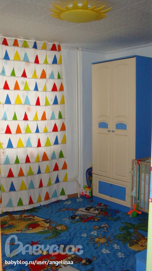 В углу планирую поставить маленький комодик, в который будут складываться все материалы для рукоделия (краски, карандаши, фломастеры, пластелин, раскраски и т.д и т.п.) Уже присмотрела один. Он кстати и закроет розетку с проводами, самое опасное место для маленьких шкодных ручек. Рядом встанет маленький столик и стольчик для занятий (хочу икеевские из серии Маммут голубого цвета). Кстати на двери и на батарее наклейки из моей закупки)))