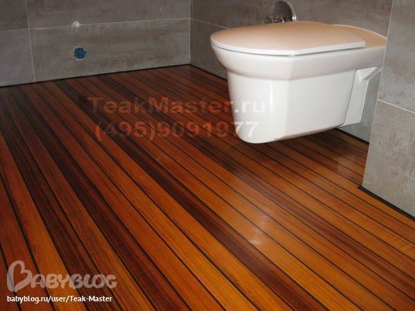 породы дерева, которые можно стелить в влажных помещениях: тик (самый хороший вариант, но очень дорогой), мербау, лиственница, кумару, ипе, лапачо, ятоба, тайгервуд, гарапа, кабреува, масарандуба, гевея, ироко, бамбук по укладке массива в ванной нашла такую инфу:берется ванная комната, укладывается гидроизоляция. Далее наливается стяжка. На нее пристреливается влагостойкая фанера либо обычная, но обработанная спец.составом для придания водостойкости. Далее, очень желательно, чтобы тик не лежал на стройке долго, потому что он достаточно быстро впитывает влагу и раздается вширь. Клей для тика производит компания Sikaflex. Перед укладкой тик нужно подготовить, спилив у каждой досточки шип. Далее разложить его БЕЗ КЛЕЯ по всей укладываемой поверхности для того, чтобы потом приклеивая точно знать на каком месте эта конкретная доска будет лежать. Затем каждая доска поднимается, на нее наносится клей и тут же приклеивается на то место, с которого ее только что подняли. Укладывать можно как с поперечными швами (значит спиливается шип не только под длине, но и по ширине доски), так и только с продольными (это значит что в поперечном срезе доска входит шип в паз без зазоров). После того, как один ряд выложен, размечается следующий на расстоянии 4 мм от предыдущего. Приклеивается весь. После того, как весь пол выложен (естественно с тепловыми швами примерно 8 мм по периметру) и все это дело высохло как следует, тот же самый клей-герметик для тика Sikaflex вставляется в монтажный пистолет и швы аккуратнейшим образом заливаются им. Сохнет. Сохнет довольно быстро, если пачкаете что-то - вытирать тут же иначе не догрызетесь потом. После того как все это богатство высохло - шлифовка. Долгая и муторная шлифмашиной с пылесосом желательно. После этого пол покрывается маслом для типа Premium два раза (минимум, можно три) с периодом в сутки на полное высыхание и впитывание слоя.