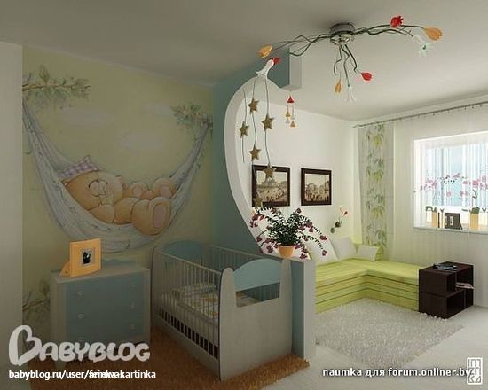 Еще у нас натяжной потолок , в котором и люстра и встраиваемые лампочки.Люстра освещает детскую часть, лампочки -нашу. Планируем визуально разделить обоями-компаньонами.