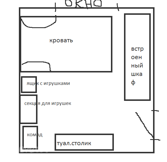 А если кровать отодвинуть ближе к центру. В осовободивееся место к окну столик и стульчик. Надо, чтобы ребенку для рисования было больше света. можно попробовать вдоль стены так - секция игрушек-кровать-комод. Возле окна стол и стул. Вместо туалет.столика все остальное. Жаль, нет размеров ни мебели ни самой комнаты, так сложно.