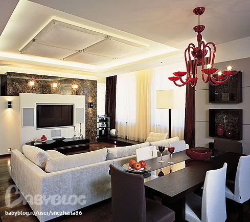 здорово, но скушновато. Красивые шторы это тоный вариант, какой нибудь напольный светильник, подходящий под интерьер. Я заболела светильниом ввиде вазы большой, а в ней листья прямые, типа камыша, и шары на трубочках, там вставлены лампы, так здорово, вым бы подошло сюда. Выделить зону все таки за телевизором. Или наклейки интерьерные за диваном сделать. Вообщем добавить красок.