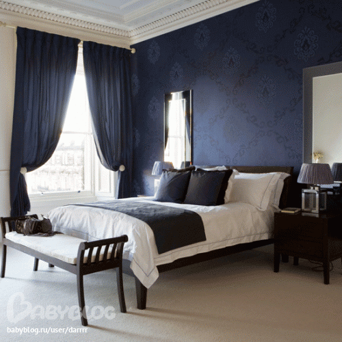 спальня. тут нравится сочетание темное дерево и глубокий синий!!! справа гардероб!!! хочу,чтобы стена была из закаленного стекла, с каким-ниб рисунком в стиле комнаты