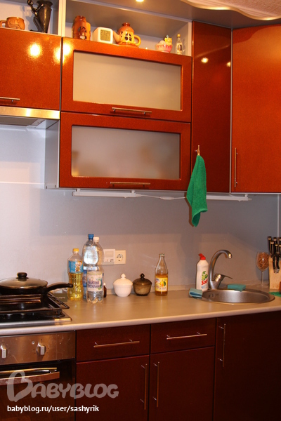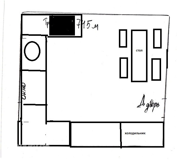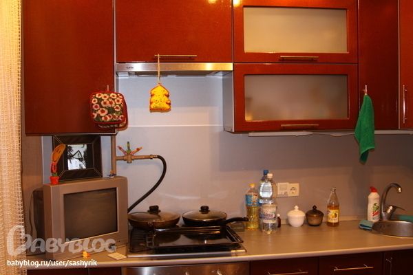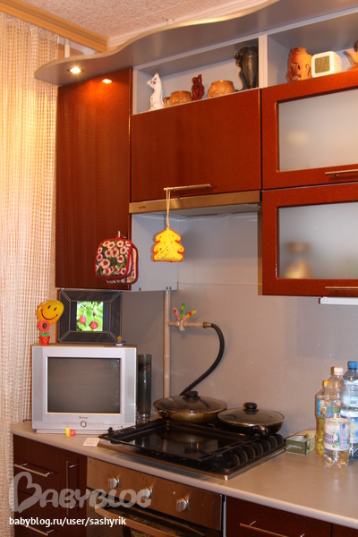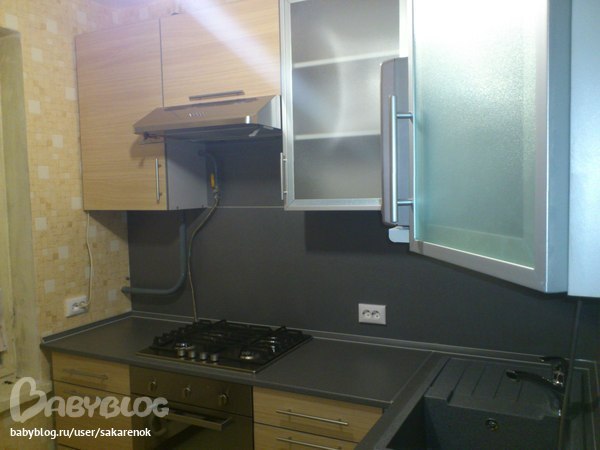 а у меня даже фотки есть)) размеры точно не скажу, но кухня у нас тоже 9 квадравтов! но труба у нас также находится, мы ее собирались закрывать..но на фотках увидишь, что так и забили на нее)) нет ничего более постоянного, чем временное))