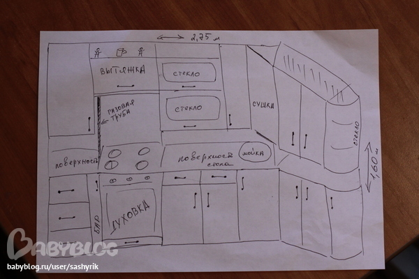 У нас кухня 9 метров. Размеы примерно ваши - 1,5 на 2,7 выходит. Гарнитур еще не заказан, но от руки нарисован, сегодня поедем смотреть готовый проект. Тот бок, что уже, у нас идет так: закругленный шкафчик (закрытый), потом три выдвижных ящика больших (один под вилки-ложки, другие под кастрюли), потом таой же угол с раковиной, На другой стороне маленький ящик, потом шкаф со стиралкой, духовка и посудомойка. и все, окно. Над посудомойкой у нас шкафчик прям от столешницы со стеклянной дверью - для бокалов и прочей красивой посуды. Над плитой - вытяжка и шкаф, ну и все остальные шкафчики.У нас верхние шкафчики до потолка будут, так как почти весь низ занят техникой...