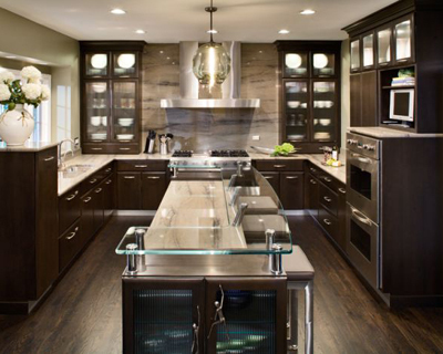 Вы сделайте как на фото, на стене прямо повесьте красивую вытяжку, от неё в разные стороны пойдут горизонтальные ящики, будет полно рабочей поверхности. А раковину перенесите на левую сторону, её и не будет особо видно. Тем более можно подобрать гранитную (и к ней гранитный смеситель), будет очень красиво! А и не надо, чтобы сидели и на диване и за столом. За столом пусть сидят на стульях, а если много народу или кто-то уже наелся, может просто присесть на диван.