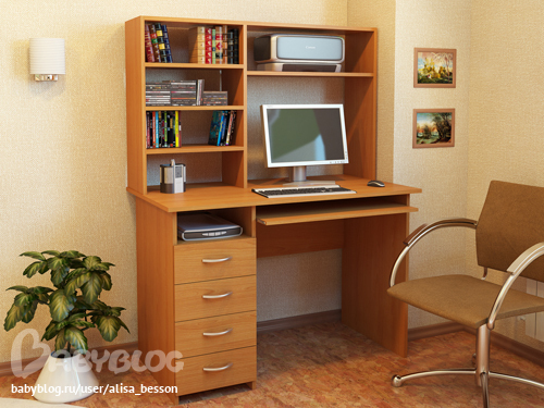 Мне кажется вам не нужен комп. стол - ну зачем, скажем вам подставка под клаву? Мы себе купили вот такую штуку - http://www.ikea.com/ru/ru/catalog/products/S19861339/#/S59861342 во первых, и пространство отделяется, получается рабочая зона со столом. Стол оочень большой и удобный. Благодаря тому, что куча ячеек, можно оборудовать в каждой ячейке полочки-коробоки-булавочницы и коробочки с обрезками и т.п.. Все в той же икее - выбор сами знаете! А если нужна пара выдвижных ящичков, то тоже можно докупить под этот стеллаж ящики.