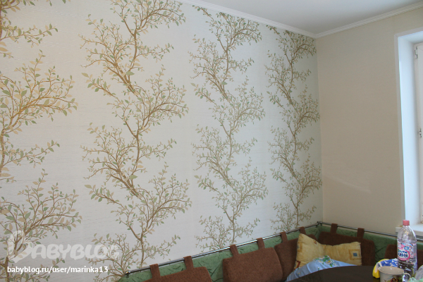 А я считаю, что на этой стене рамочки будут лишние. У вас здорово сделано, на одной стене сад, на другой яблочки. Если уж хочется повесить рамочки, то повесьте их настене без обоев, около окна. Одна под другой. А вот часы, как раз можно повесить на стену с обоями. Они не перегрузят стену. И еще, можно вопрос? Что это за обои? Винил? И если можно, какая фирма?