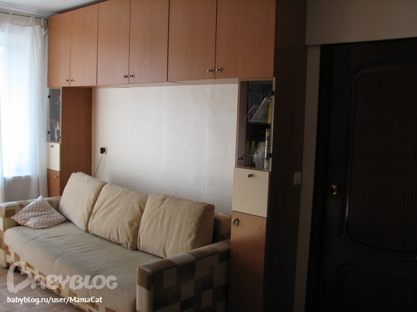 Сейчас у нас так: вход, напротив окно, по левой стенке: стенка и телек в ней, по правой у окна комп. стол, потом наш диван и кроватка детская. все! все стены заняты...
