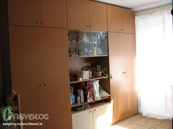 я сразу извиняюсь за бардак. Шкафы в комнате друг на против друга. По середке место под ТВ - но муж там сделал полку.