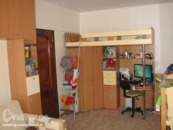 Торец комнаты. Кровать-чердак. деть спала там с 4х лет. Очень удобная конструкция - когда приезжали гости - туда умещались 2е взрослых. Крепкая очень.