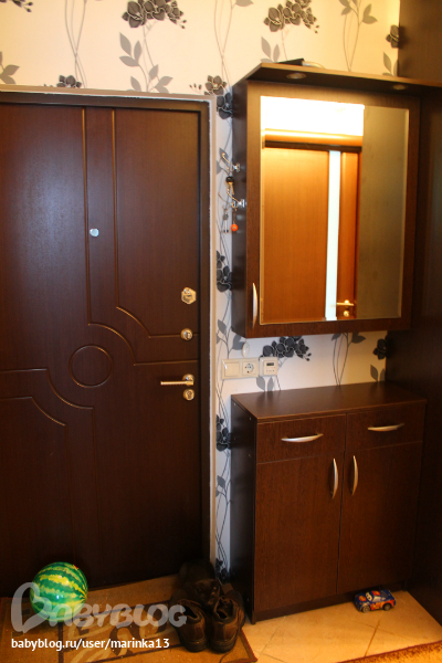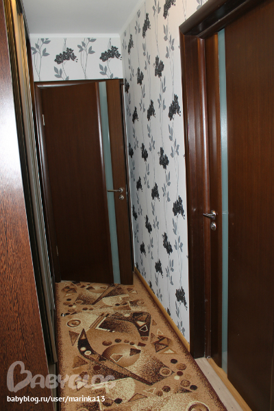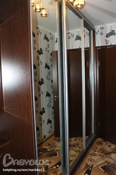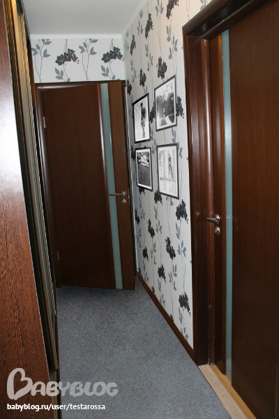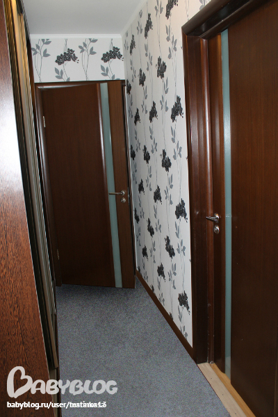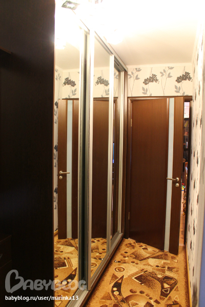 помню к кому-то в гости заходила, корридор выдержан в таком же стиле, даже шкаф тоже большой зеркальный, а на полу был ковролин терракотового (или немного кораллового) цвета. там ещё какая-то картина у них висела с золотистыми и серебристыми красками - очень гармонично было.