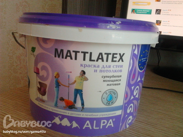 Маттлатекс краска акриловая воднодисперсионная матовая для стен и потолков. Время высыхания одного слоя при Т 20 градусов - 1 час. Запах не сильнее чем у гуаши. Я сама запах краски плохо переношу, а этой красила сама, и зал и кладовку, к стати, вещи в кладовку сложили уже через 2,5 часа. Можно корел добавить какой необходимо.