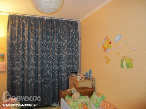 Я немного расстроена, потому что ткань дома выглядит несколько иначе, а именно цвет. В магазине шторы были много светлее, освещение-с... А у нас пока неудачная люстра, она тоже подлежит замене в ближайшее время. как только финансы позволят. Напомню, что шторы в детской.