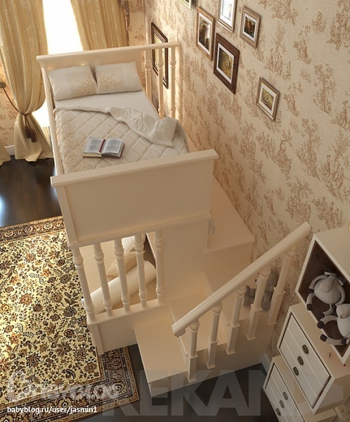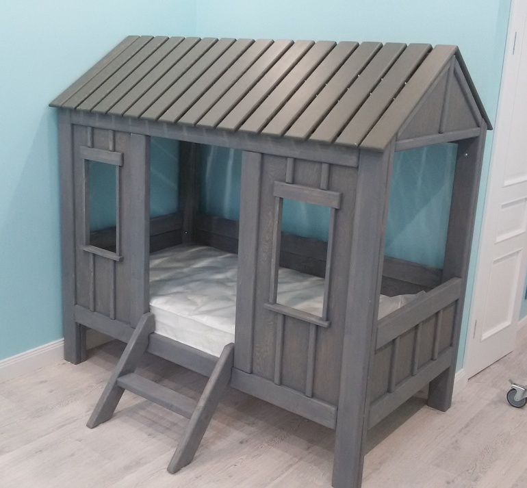 У меня по проекту получился немного другой домик: кровать внизу,наверху игровой домик, ступени-ящики. Цены безумные (в одном месте даже 350тыс запросили). Так что пока в поиске изготовителя.