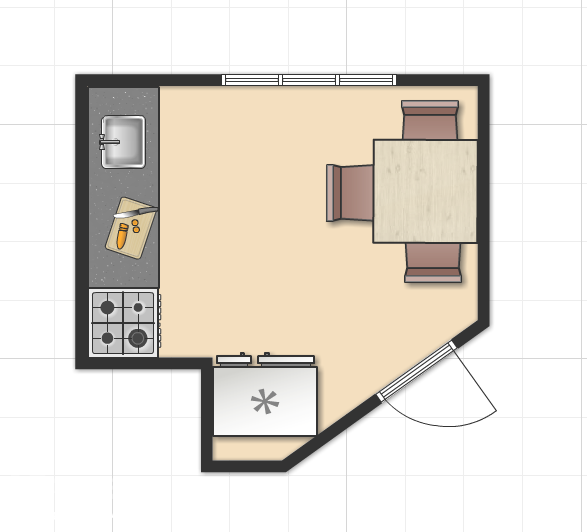 Добрый день Вера! Помогите мне пожалуйста. Нестандартная кухня. Как бы Вы разместили на этой кухне холодильник, варочную панель, стиральную, посудомоечную машину и все остальное.