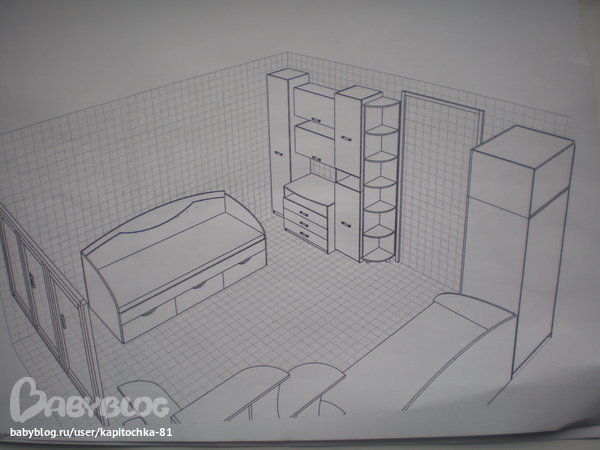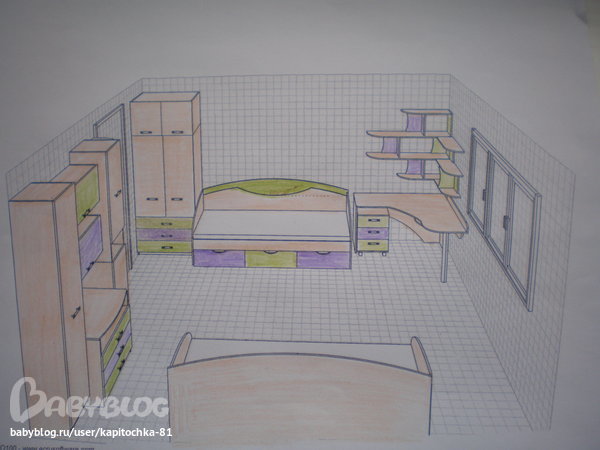 Интерьерное решение детской комнатыИмеется комната 4 на 4кв.м. для 2х девочек.Вот как будет стоять мебель.Помогите разукрасить мебель ,основной цвет мебели будет светл.бежевый,очень нравится салатовый и сереневый.Как совместить эти цвета,а может они вообще не сочетаются,помогите,уже всю голову сломала.Сама вот что придумала,но как то не так.Подскажите что??????