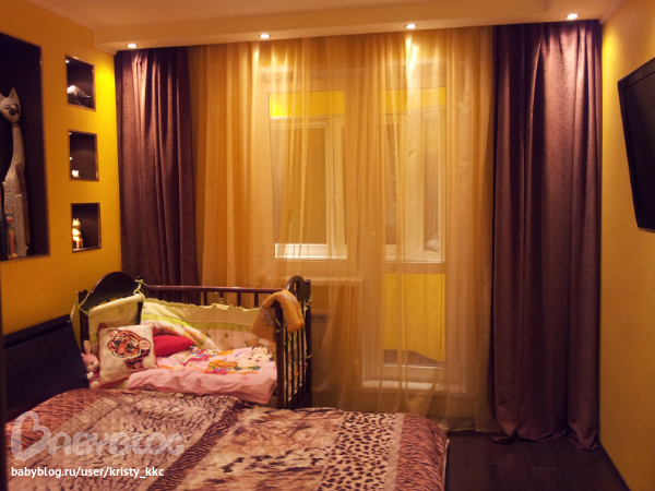 Интерьерное решение спальниФоткать конечно такие мелкие помещения (да еще и на тел) проблематично,но сделала максимум и вот что получилось. Спальня где-то 3,5 на 3,5 м. Балкон имеется,но объединять не стали. Когда делали ремонт о ребенке даже не думали,поэтому кроватка мягко сказать не вписывается,раньше стояла с др стороны,когда стала взрослее поставили рядом. Так было удобнее и без истерик. Думаю сейчас и одна нормально будет спать,но для этого надо будет обдумать новое спальное место.