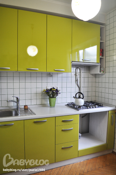 кухня классная, цвет сочный, а вот плитка белая не очень. как-то банально смотрится. раньше помните везде такая квадратная форма была и именно белая. я бы сделала другую форму и в шахматном или другом порядке с вкраплениями на плитке салатового как кухня цвета элементами. вотстильно было бы!