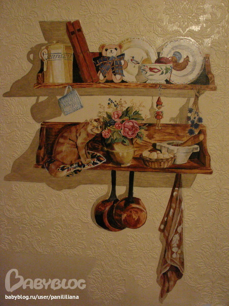 Нет,нарисовано на стене покрашенной масляной краской,но потом через много лет краска на стене потрескалась (чайник рядом стоял и парил) и я решила реставрировать- взяла остатки выпуклых обоев и наклеила кусками вокруг картинки,а затем закрасила тем же колером, что и основная стена. Получилось,лучше чем было.