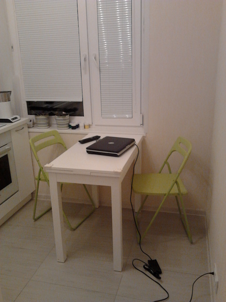 Не о таком столе я мечтала,но это Икеевское чудо идеально вписалось в пространсво кухни и, похоже, простоит там дольше, чем планировалось :) Стол расскладывается, это его огромный плюс.