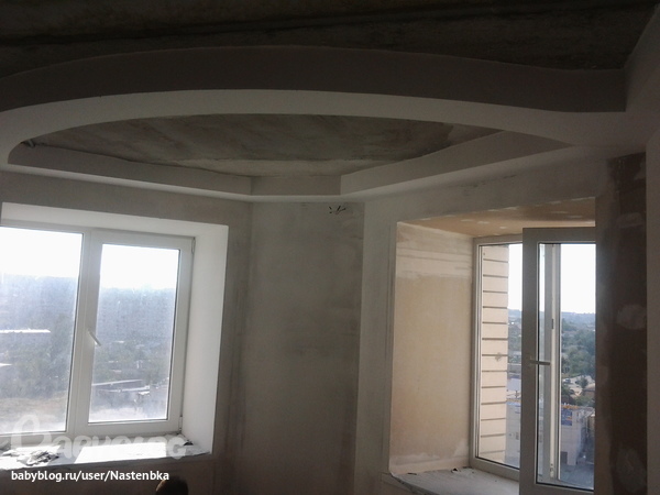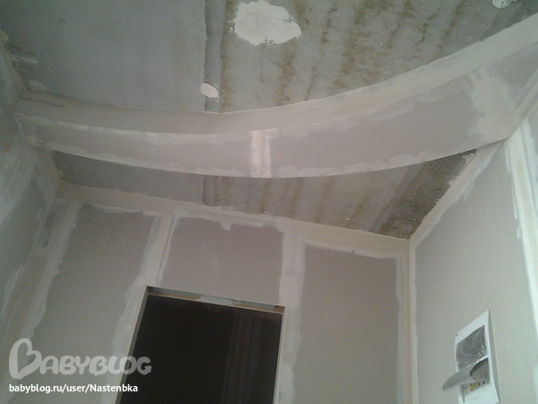 в коридоре ничего особенного, просто обшиты стены гипсокартоном (впрочем как и везде), и сделан небольшой разделитель из гипсокартона на потолке, задуманы там встроеные светильники и 2 цвета натяжного потолка.