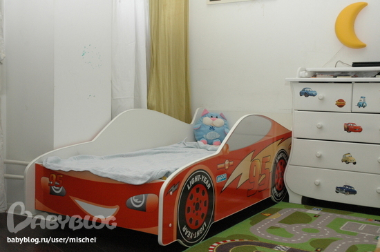 Сейчас у нас в детской стоит небольшой диванчик, комод, детский столик. Так вот, на диванчике может расположиться папа, во время игр с ребенком, детишки, которые приходят к нам в гости. На кровати уже так не посидишь? Тем более,что борта у нее такие высокие.
