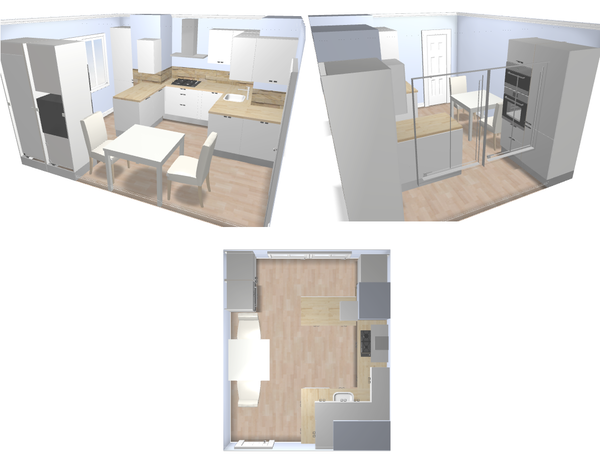 Площадь кухни вроде позволяет сделать красиво и удобно, но 2 воздуховода по правой стене сильно уменьшают рабочую зону. Очень нужно решение, которое позволит "обыграть" воздуховоды таким образом, чтобы максимально увеличить рабочую зону, например, добавив вертикальный выступ в виде барной стойки, справа при входе в кухню, если смотреть лицом к окну. Газовая плита и раковина должны быть в тех же местах, как на рисунке слева. На кухне также нужно предусмотреть место для техники: духового шкафа, вытяжки, микроволновки, пароварки, и если получится - посудомоечной машины. Куда затем поставить стол, стулья и холодильник? Какой цвет подойдет к бело-голбым обоям, чтобы все более менее сочеталось? Помогите пожалуйста, буду очень признательна.