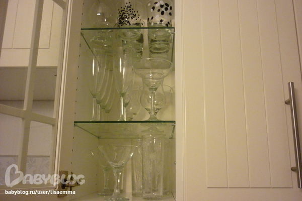 а вот фота полочки под "стекло"- рюмки...фужеры...бокалы...это у дочки - над сушилкой- высоко- нужно на стульчик вставать- но и фужерами ведь редко пользуемся