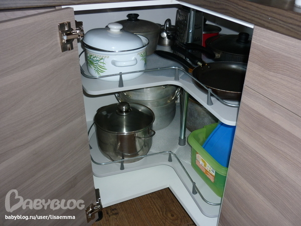 под кастрюли и сковородки- шкаф с корзинами выдвижными....правда на фото пока там лежит "не то"...фотка старая....когда вещи ещё были не разложены
