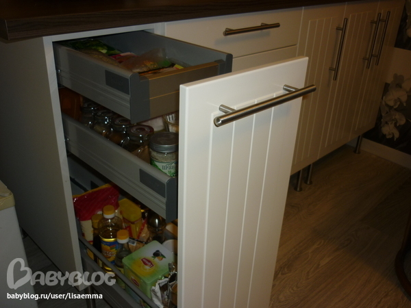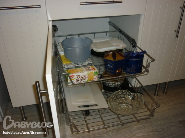 а это вот сейчас нашла фотку- как выдвигаются корзины- удобный шкаф для кастрюль и сковородок( то что там на фотке- это ещё не разложена посуда- сразу после ремонта)
