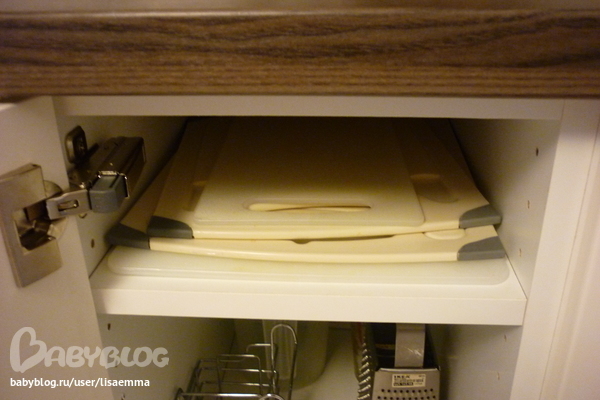 и в нижнем шкафу сделала дополнительную полку под разделочные доски