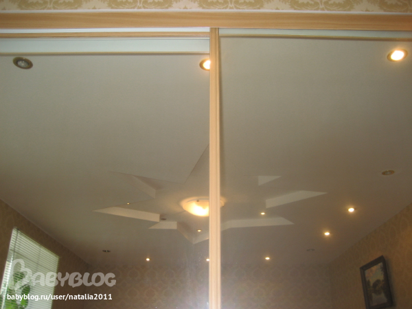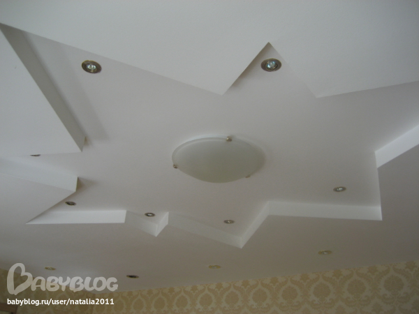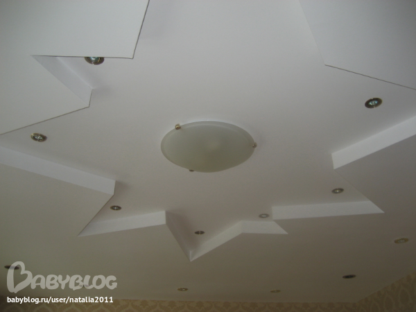 Ремонт делала давно, 11 лет назад, тогда же и рожала, ну вот пока я по больницам куролесила, строители мне наваяли такое чудо! А так как в такой период жизни времени ни на что не хватает, короче наваяли и наваяли. Сейчас уже меня это "интерьерное решение" задрало совсем и я решила от него избавиться. Но как оказалась это не так просто сделать. Приглашала несколько спецов по ремонту, и каждый меня отговаривал как мог. Очень затратно все это дело, прийдется ломать ещё и одну стену, т. к. она из гипсокартона, а потолок к ней привязан, ну и очень дорого это все выходит. Жить с таким потолком тоже не хочется совсем. Вот и думаю я, а может покрасить его разными цветами (низкую часть в тон обоев например, внутреннюю- звезду-посветлей), или светильники поменять или ещё чего-нить сделать. Девочки,давайте пофантазируем, а???? Одна голова хорошо, а много- это совсем другое дело. Может и выплывет, то правильное решение. Заранее всем спасибо! Фоток вставлю под всякими ракурсами.