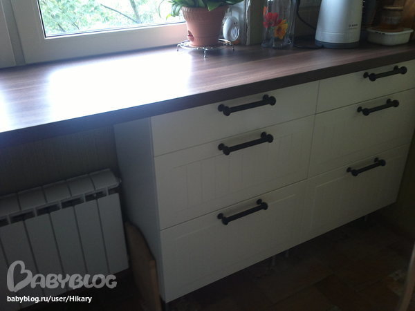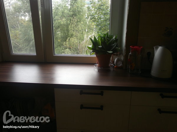 Сборщики приехали пятнадцатого числа. Приехал бригадир и его напарник - ребята просто молодцы. Сделали все быстро, аккуратно, воплотили в жизнь мою мечту - столешку под окном. И не пришлось везти ее ни в какую мастерскую на распил, как впаривал прошлый сборщик (кстати, он в этой компании уже не работает). Так вот, распилили очень точно, только в одном месте осталась щелочка, но ее не проблема заделать. Все встало как влитое. Плиту только никак не можем подключить - но это уже мелочи)))