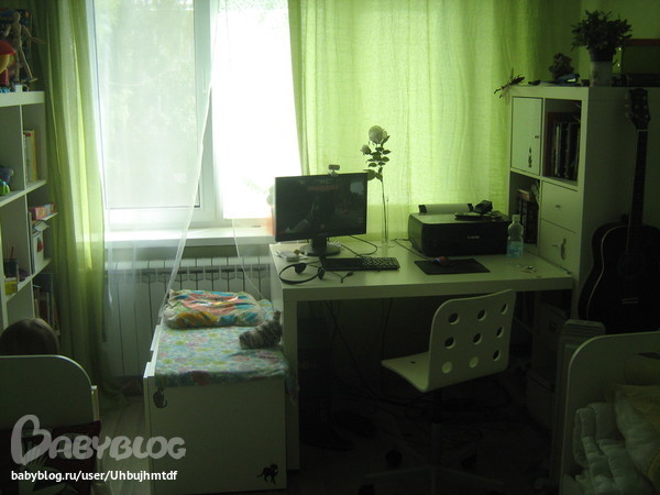 Оч красивая комната! Такая нежная,светлая! А стелаж,где книжки и игрухи у вас не икеа случайно? Поделитесь сылкой)