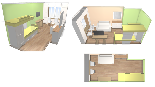 Шкафы по обе стороны от окна, вверху антресоли, под окном стол, можно его использовать как рабочий, можно посадить деток покушать. Для вас диван, который расскладывается вперед, ТВ на противоположной стороне от дивана, под ТВ стол консоль, например: http://www.mespana.ru/catalog/3261.jpg, http://www.formul.ru/_CATALOG_FILES/prods/169/169086/169086-268_wood.15403.png ( в сложенном виде это консоль, а в разложенном это полноценный стол), для деток двухярусная кровать: http://www.divandi.ru/public/images/db/lot/image640/8/4/6/6.jpg. Можно между ТВ и детской двухярусной кроватью сделать штору или легкую перегородку, чтобы свет от телевизора не мешал спать.