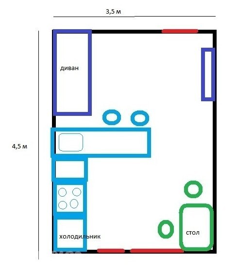 Мне кажется, все вполне реально. Ширина кухонного уголка будет примерно 2,2 м (холодильник стандарт 60 см, плита 60 см, островок, который справа от плиты метр, а то и больше) Итого, 4,5 - 2,2= 2,3 м - это расстояние у Вас есть для дивана. Хорошо бы, он стоял не вплотную к кухне, а с зазором сантиметров 30. Диван получится небольшой.