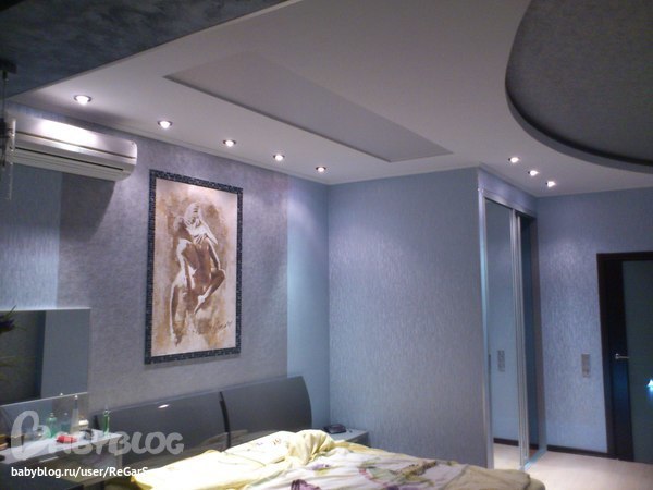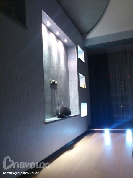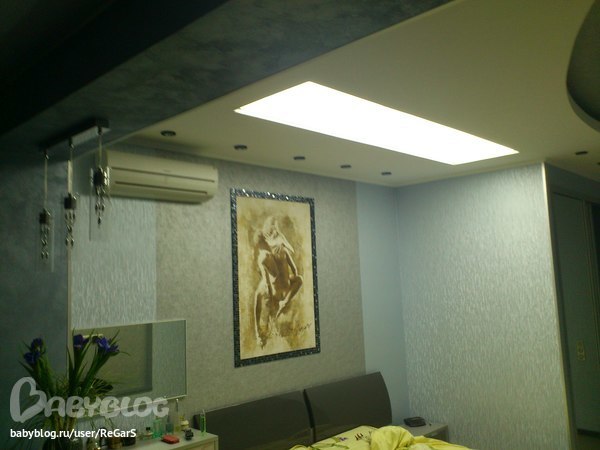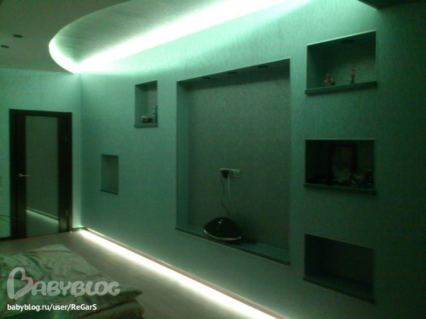 на последнем фото просто рассеянный свет,поэтому такая цветопередача.да телефон дурацкий фотик) там в нише светодиодная лента холодная,а светит она через полупрозрачную пленку для натяжного потолка которая) получается довольно яркий рассеяный свет над кроватью