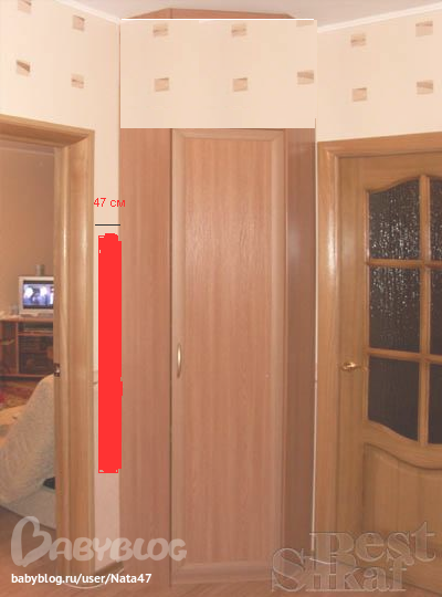 ),в заказанном шкафу буду хранить свою косметику и т.п. А рядом с угловым шкафом нужно повесить небольшое зеркало (главное, чтобы лицо влезало:))... ). А какой формы незнаю?! Прикрепляю картинку с чужим шкафом, только расстояние от шкафа до двери у меня побольше - 47 см. Помогите придумать, времени у меня 2 недели до установки.