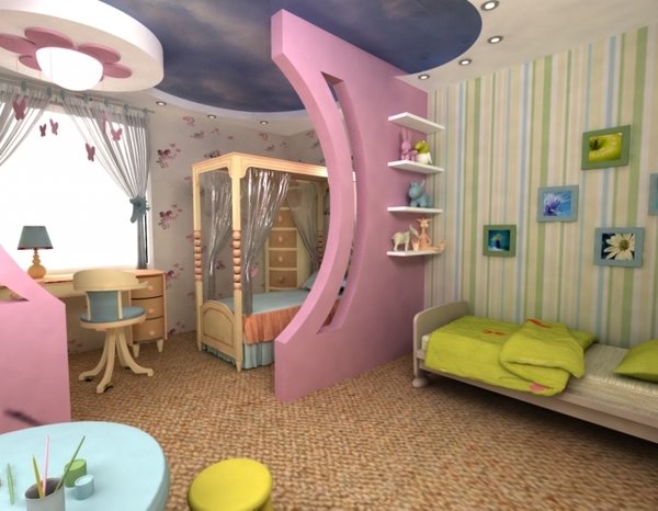 Интерьерное решение детской комнатыПодскажите как лучше поделить на зоны детскую, разница между детьми 10 лет....младшему 9 месяцев. Нужно так сделать что бы они потом года через 4 друг другу не мешали.....