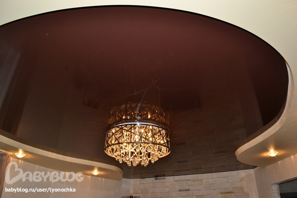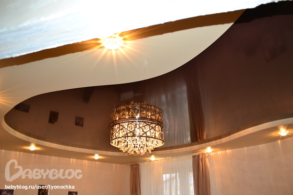 У нас гостиная сложной формы,трапеция, почти шестиугольник,мы придумали такой потолок...Нам очень нравится..ОБоев пока нет,но потолок уже виден.