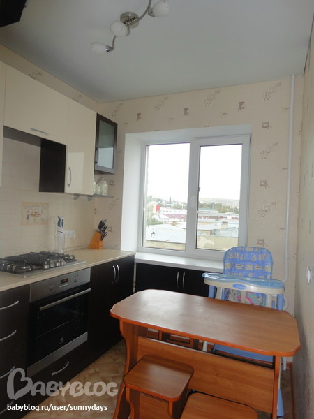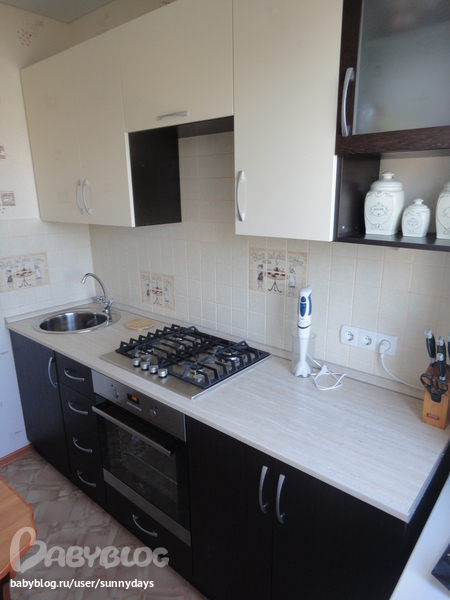 Кухня у нас 5кв.м. Помещение настолько маленькое,что даже с трудом удалось что-то сфотографировать. Поэтому кухня кусками и с разных ракурсов. Длина стены по которой стоит мебель 2,3м. Кухню делали на заказ по индивидуальным размерам. Эскизы придумывала и рисовала сама. Да,кстати,холодильник стоит в коридоре.Ну,конечно,у нас нет особых наворотов и всякой новомодной техники вроде посудомойки и др.Из техники - разве что кухонный комбайн,его расположила в нижнем шкафу.Достаю по необходимости.Не люблю когда столешница заставлена всякой всячиной,так просторнее кажеться.Вообщем у нас простенькая кухня очень точно соответствующая нашему микроскопическому помещению.