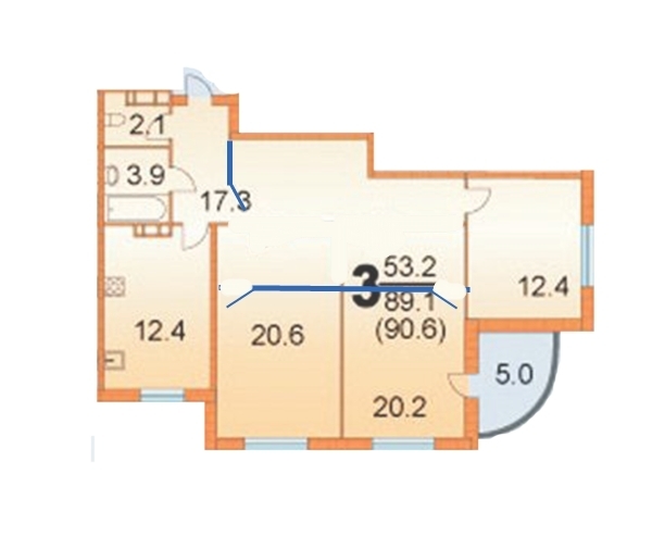 Захотелось вам немножко порисовать:) если не боитесь косых стен - можно 4 комнаты сделать. Только у меня на плане углы острые, можно полукруглые обтекаемые делать И дверь в комнату с балконом не туда поставила, лучше ее на другу стену