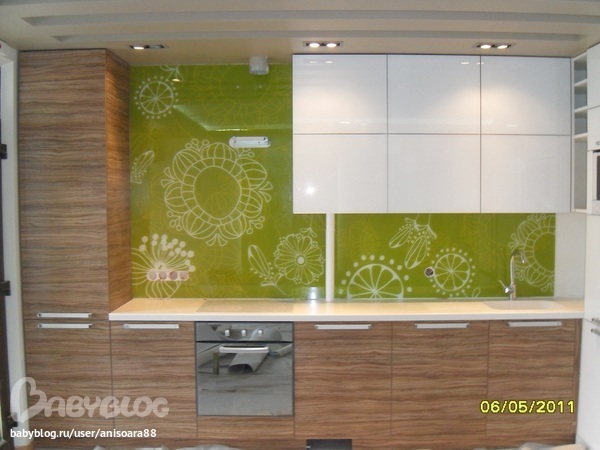 У меня белый гарнитур, салатовый фартук и полосатая стена напротив))) только полоска поспокойнее
