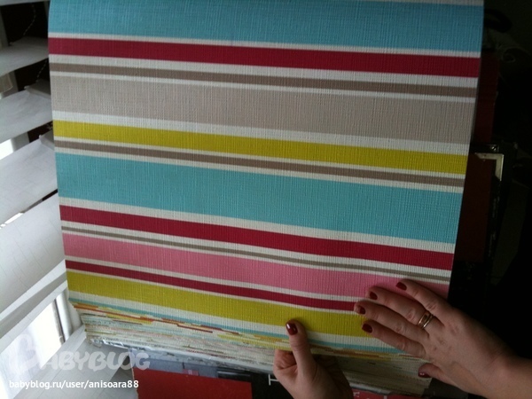 Я уже ответила ниже, что мы еще там не живем, не все сделано. Обои у меня из другой серии. Белые, а них салатовые и желтые полоски. А из той серии, что ваши полосатые у меня в детской обои. Там на белом фоне салатовые овалы трех оттенков. Между прочим отлично клеить и не видно стыков.