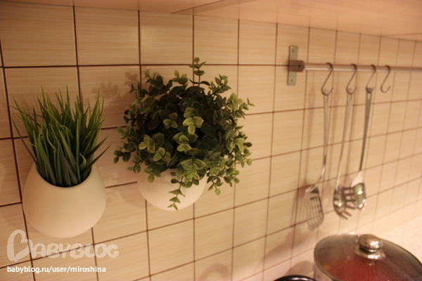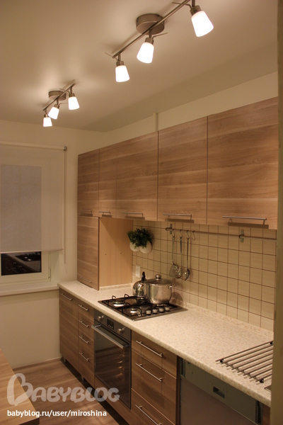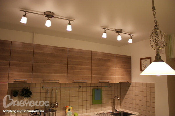 Балдеем от обилия света, т.к. сторона северная и лоджия за окном. Никогда в этой кухне не было так светло.(жаль, фотик темновато сделал все). Особенно нравится лампа над столом, такая приятная обстановка получается за ужином.