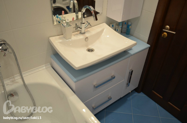 Трубу под раковинной срезали(это совковый палотенцесушитель).Делали новую разводку в стояке, под хол.воду, горячую, и под новый палотенчик. Далее тянули трубы под полотенцесушитель по стене, и устанавливали его на противоположную сторону( на фото в зеркале видно где он стоит).Да!под раковиной два выдвижных ящика, с право один с полочкой…
